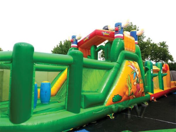 Avec ses 18 mètres de long, ce parcours gonflable offre une expérience immersive où les enfants peuvent courir, sauter, franchir des obstacles et progresser à travers différentes zones de jeu. Inspiré de l’univers western, il stimule l’imagination tout en proposant une activité physique ludique.